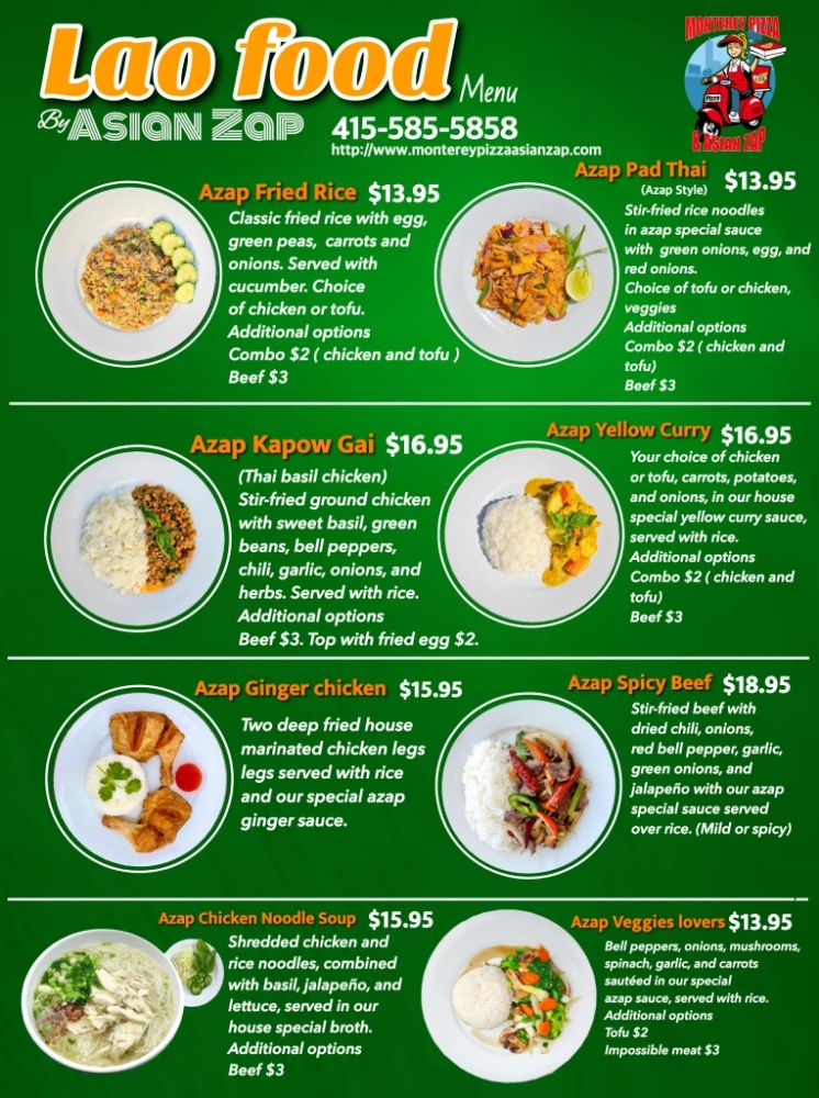 Stir-fried rice noodles in azap special sauce with green onions, egg, and red onions. Choice of tofu or chicken, veggies.Additional options. Combo $2 (chicken and tofu) Beef $3